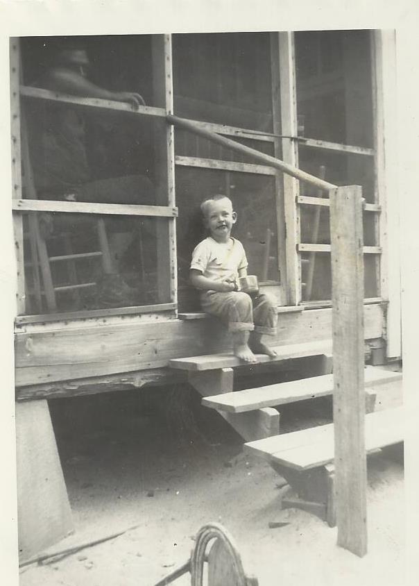 Bill Lee, 5 years of age, sitting on back steps of the old house with my dad seated in a straight chair on the porch looking out at me and my mom who took the photograph.