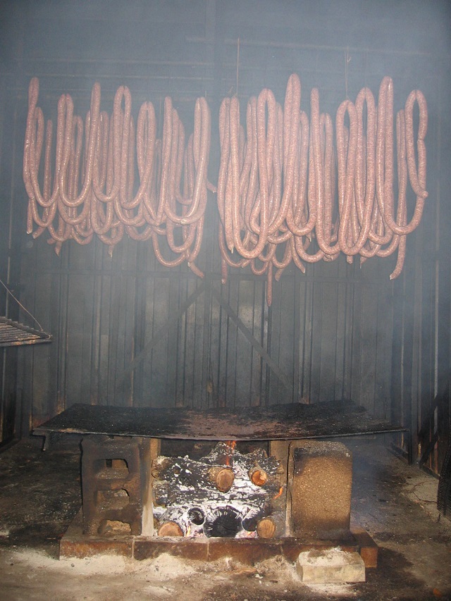 Home made pure pork link sausage smoking over a hickory fire pit. The recipe used is one handed down to my brother and me from dad.